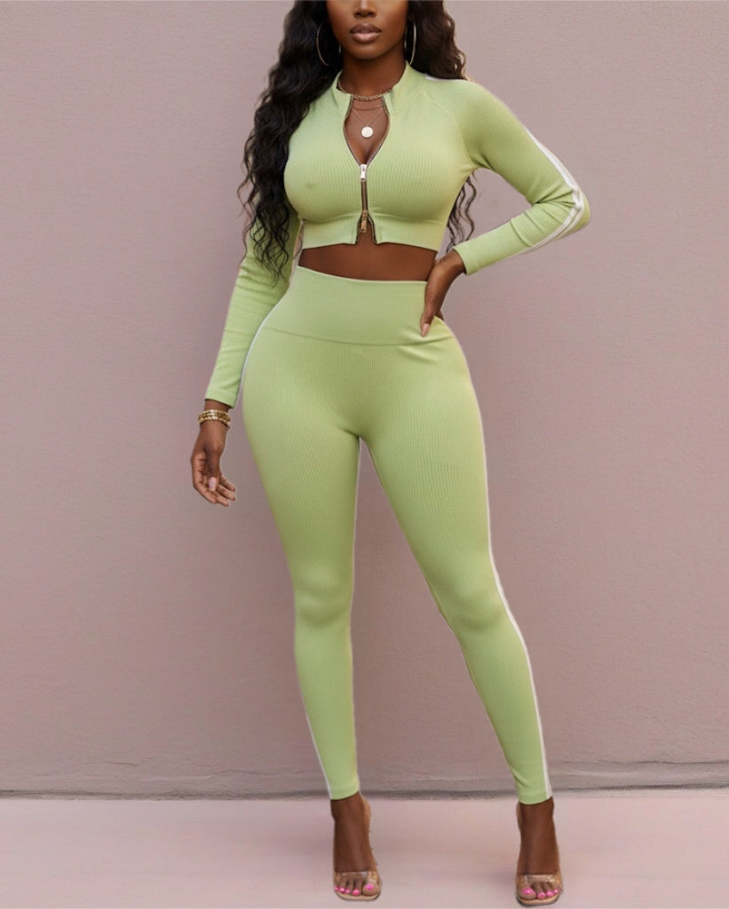 Power up your workouts in the Sage Stride Ribbed Set, designed with a sleek ribbed texture for comfort and support. Featuring bold double white side stripes for a sporty edge, this set is all about style and performance. The double-sided zippers add a versatile touch, while the sage hue brings a fresh, earthy vibe that feels as good as it looks. Perfect for hitting the gym or running errands in athleisure style.