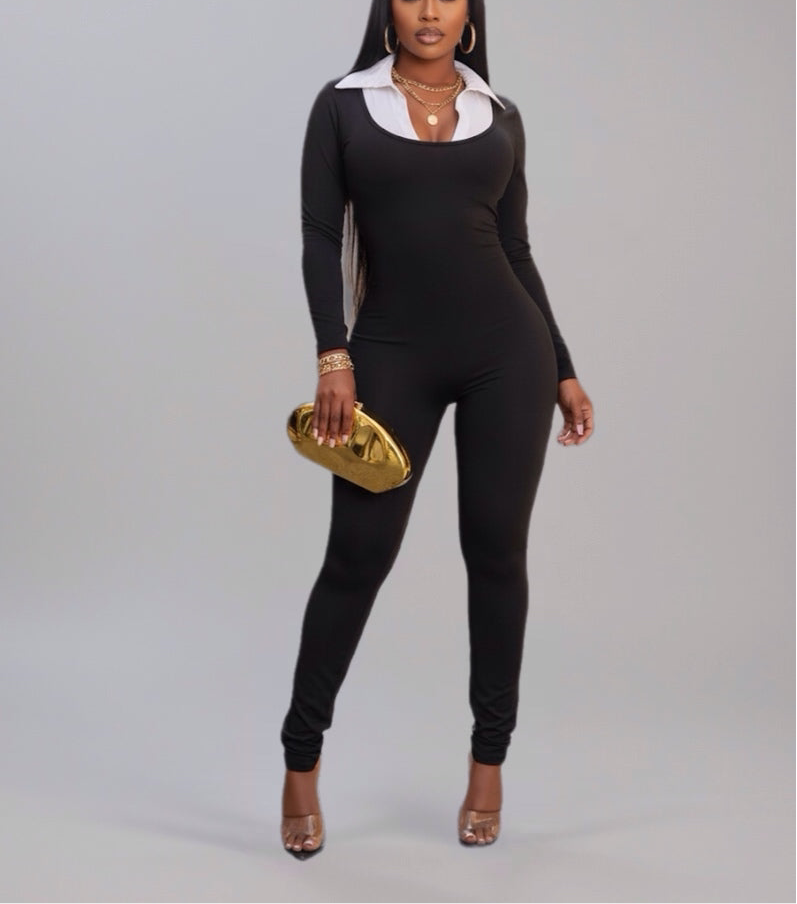 Turn heads with the Boss Moves Jumpsuit — a sleek, figure-hugging one-piece designed for bold women who own every room they walk into. Featuring a chic collared neckline with a deep plunge for just the right touch of edge, this all-black jumpsuit is perfect for dressing up with heels and statement accessories. Whether it’s a night out or a classy dinner date, this look says confidence, power, and style all in one.