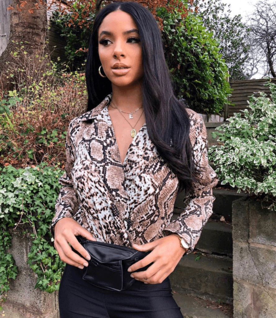 Experience the ultimate style and sophistication with our V-Curve Charm! The deep V-cut top and luxe snakeskin print one piece bodysuit exudes elegance and class.