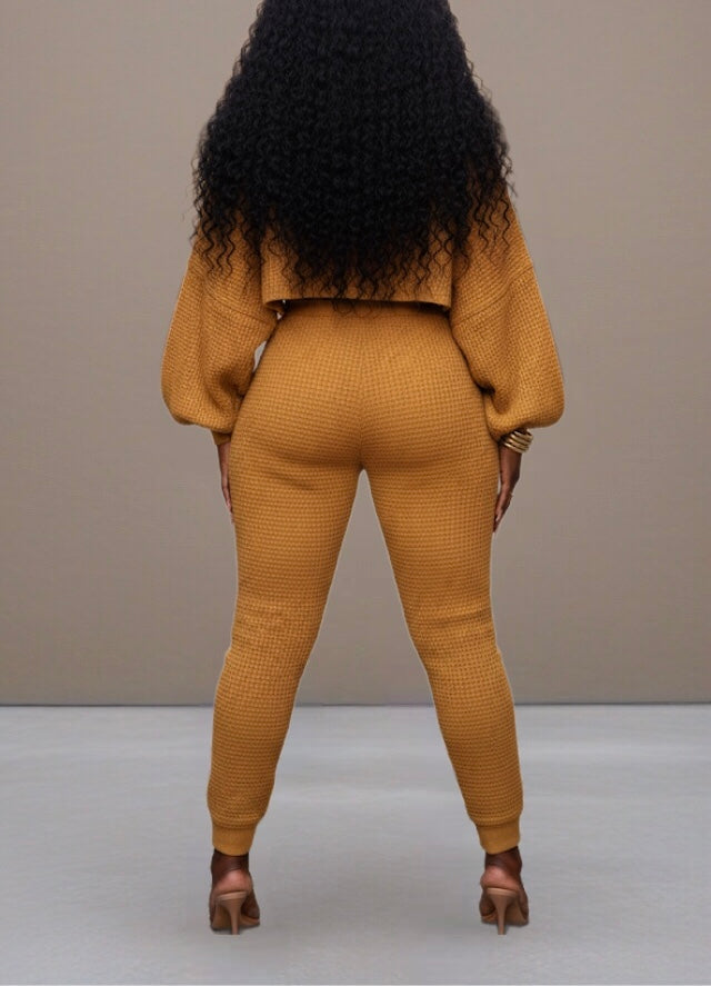 This chic two-piece knit set blends effortless comfort with a touch of luxe style. Featuring a slouchy cropped sweater with balloon sleeves and matching high-waisted joggers, the waffle-knit texture adds cozy warmth while keeping it breathable. Perfect for lounging, casual outings, or dressing up with heels and a sleek bag, this versatile set brings comfort and sophistication together in one look.